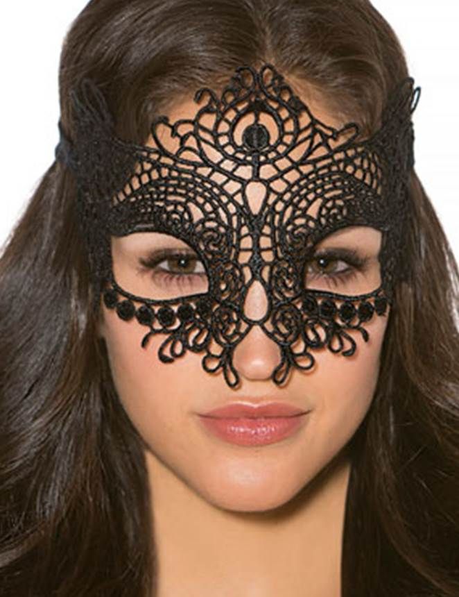 Маска из черного кружева дополнена тонкими узорами и легким блеском. Форма повторяет контуры глаз и переносицы. Регулируемые ленты позволяют настроить посадку. Идеальна для создания романтического или таинственного образа.